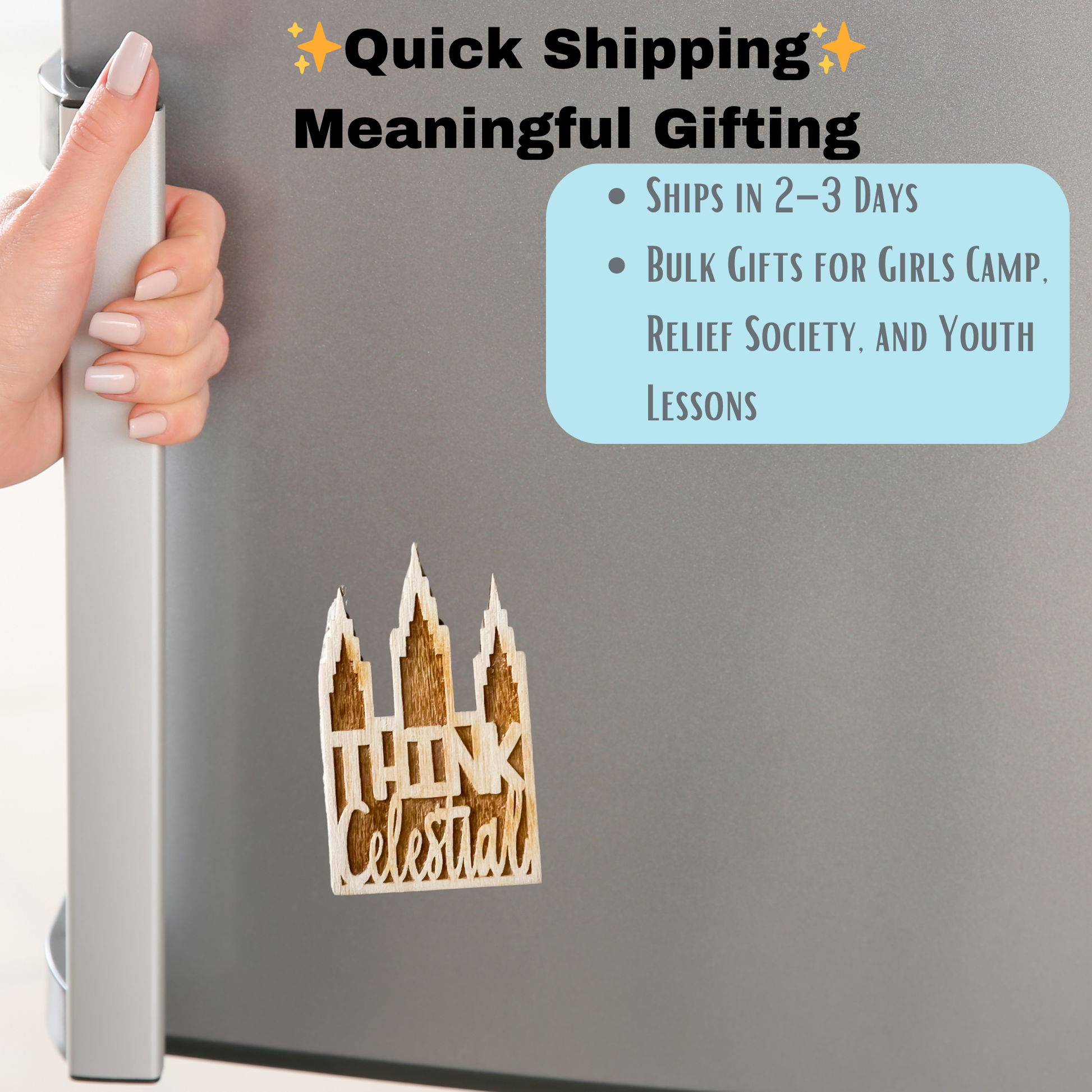 Keep Christ at the center of your day with this Think Celestial wooden magnet, inspired by President Russell M. Nelson’s invitation to focus on the eternal. This faith-filled keepsake features the uplifting message “The Best Is Yet to Come”—laser-engraved into a natural wood cutout that resembles a temple silhouette.
